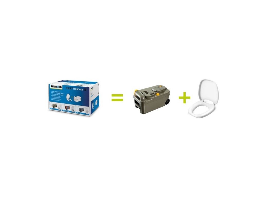 Thetford Fresh-Up-Set C 200 s kolieskami a rúčkou Táto sada obsahuje zbernú nádrž s kolieskami, sedadlo s vekom a k tomu darček - chemické príslušenstvo, s ktorým toaleta môže dostať prakticky úplne novú podobu. Fresh Up Set je jednoduchý a lacný spôsob pre renováciu kazetovej toalety.Dodatočné parametre