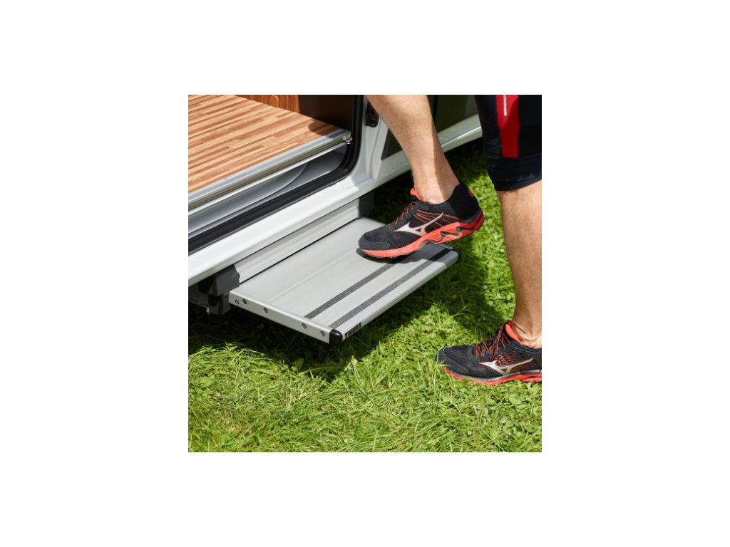 Tento robustný elektrický schodík je vyrobený z textúrovaného eloxovaného hliníka a vybavený protišmykovými pruhmi.