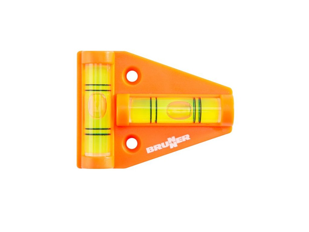 Trojuholníková vodováha s kolmými bublinkovými trubicami a montážnymi otvormi.